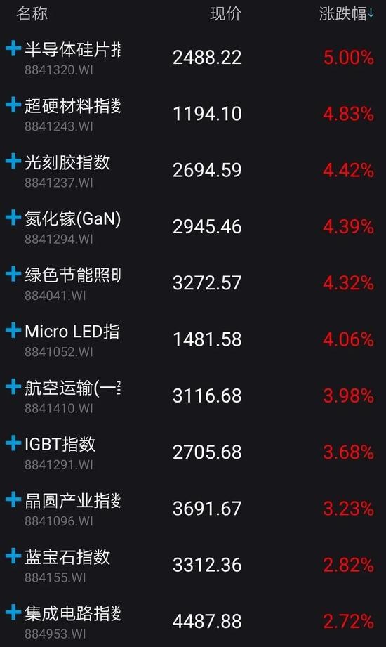 半导体产业链今日逆势崛起。截至收盘,半导体硅片指数逆势领涨,全天涨幅达5%;光刻胶指数、氮化镓指数、Micro LED指数等跟涨,截至收盘涨幅分别为4.42%、4.39%、4.06%。