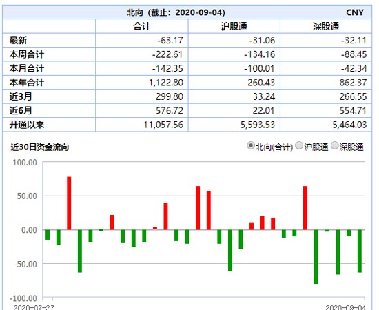 截至收盘,北向资金净流出63.17亿元,其中沪股通净流出31.06亿元,深股通净流出32.11亿元。本周5个交易日北向资金持续净流出,累计净流出222.61亿元。