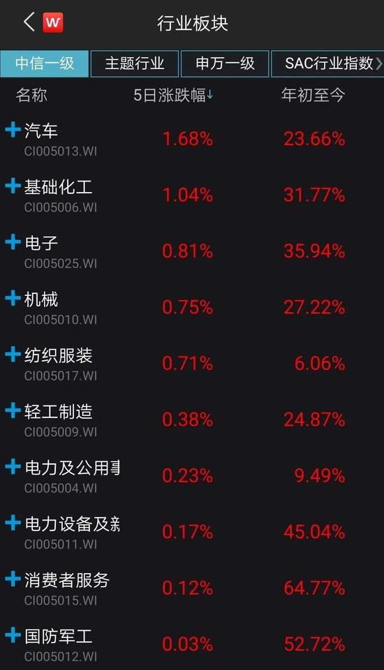 此外,化工、电子、机械设备、轻工制造跟涨,周涨幅分别为0.94%、0.69%、0.61%、0.53%。