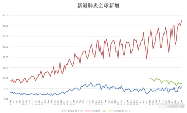 比较不幸的是,海外的新冠单日确诊病例数又又又创新高了,并且已经是连续4天单日在35万例以上,美国是连续4天在5万例以上,印度是连续5天在7万例以上。