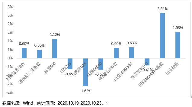 10.19-10.23全球股市涨跌互现,美股纳斯达克指数、道琼斯工业指数和标普500三大指数上周分别累计上涨0.6%、0.5%、1.12%: