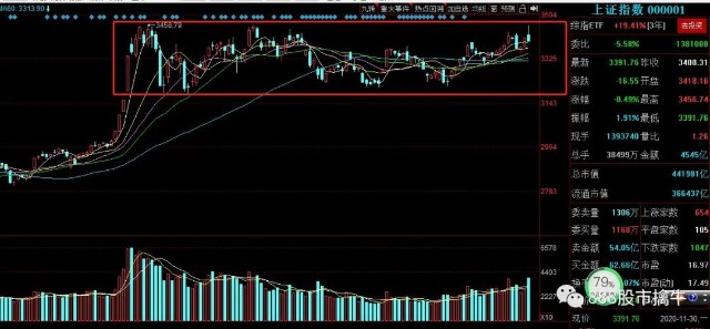 大家好我是擒牛哥,11月的收官之战不是很完美,但是月线级别依然是中阳线,今天的行情走的比较戏剧化,早盘大家都在欢呼创新高,距离新高只差2个点无功而返;午后随着港股的跳水早盘助攻的三大勇士(券商、银行、保险)全线回踩,甚至出现跳水,最终指数翻绿下挫,形成日内的反转状态;而创业板股指本身处于支撑区间,午后虽也伴随着主板指数一度下跌,最终还是艰难的收红,涨幅不大。