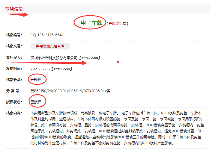 雄帝科技获电子车牌发明专利!