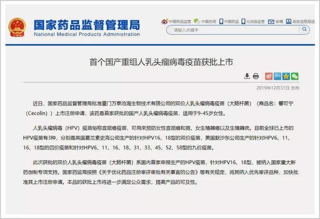当日,国家药品监督管理局官网终于挂出了“首个国产重组人瘤病毒疫苗获批上市”的消息。