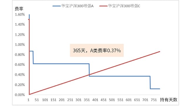 6、第365天,持有C类的费率(0.40%)将超过A类(0.37%),从这一天起往后,持有A类更划算;