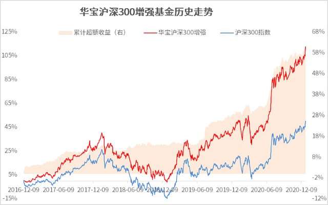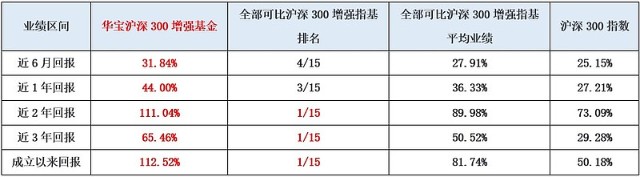 具体来看,截至2020年12月31日,最近3年华宝沪深300增强基金净值增长率65.46%,同期全部可比沪深300增强指基平均净值增长率29.28%,华宝沪深300增强基金胜出36.18%;最近2年华宝沪深300增强基金净值增长率111.04%,同期全部可比沪深300增强指基平均净值增长率73.09%,华宝沪深300增强基金胜出37.95%;最近1年华宝沪深300增强基金净值增长率44.00%,同期全部可比沪深300增强指基平均净值增长率27.21%,华宝沪深300增强基金胜出16.79%;最近6个月华宝沪深300增强基金净值增长率31.84%,同期全部可比沪深300增强指基平均净值增长率25.15%,华宝沪深300增强基金胜出6.68%。