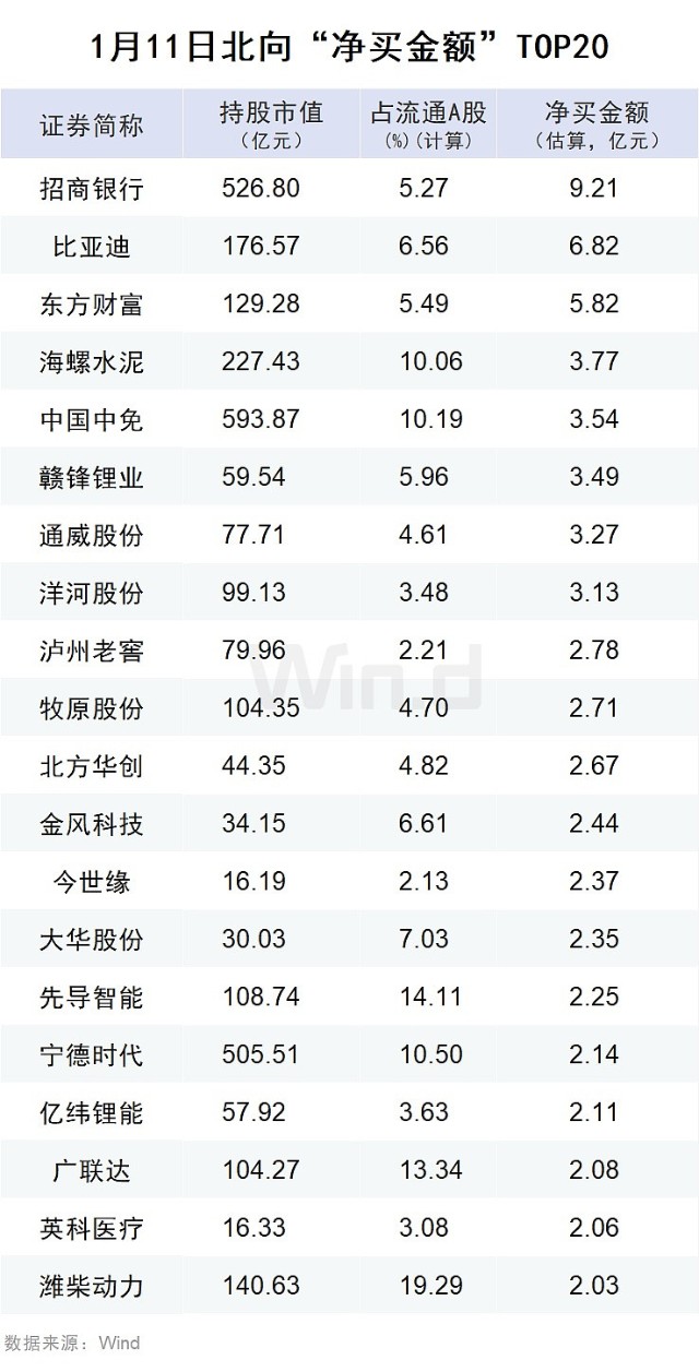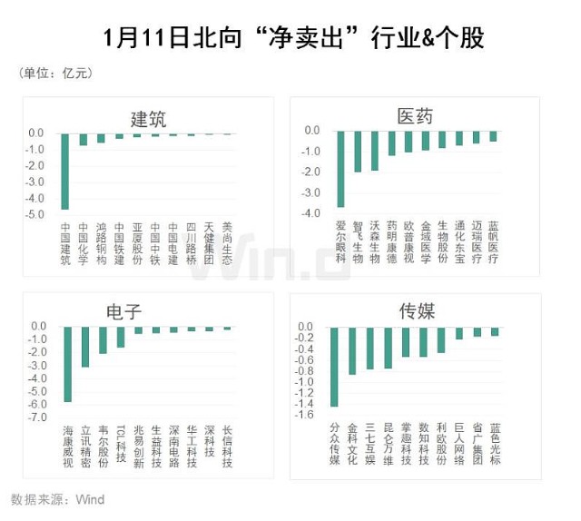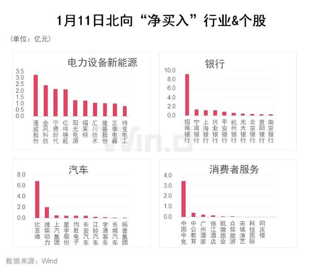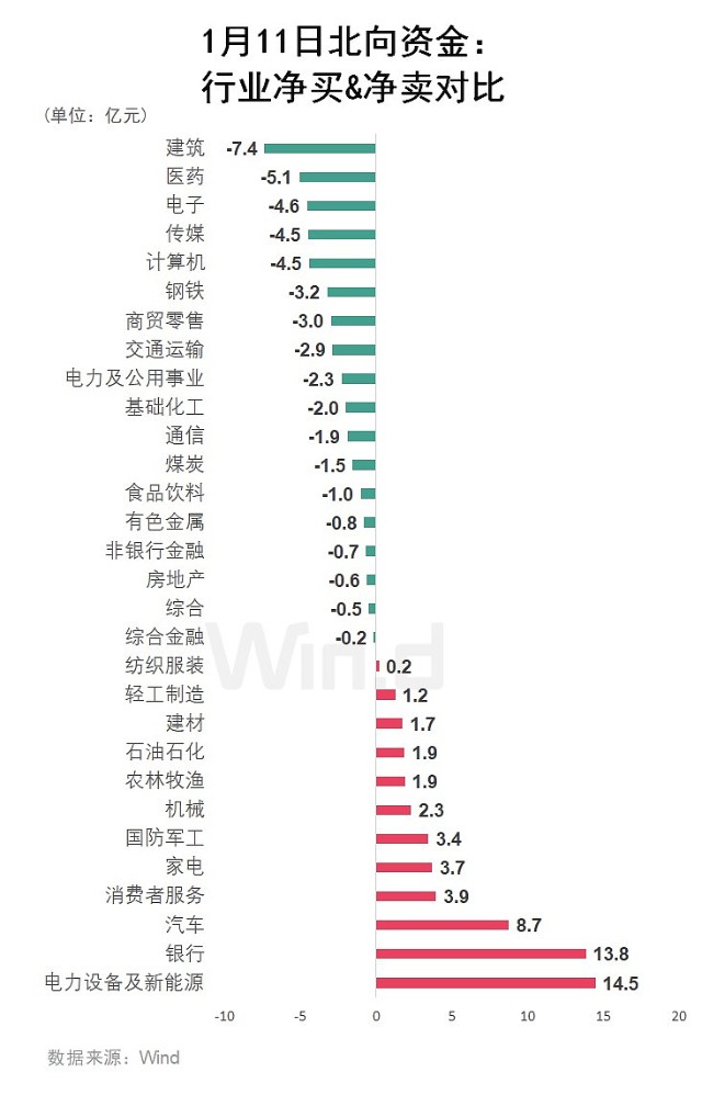 Wind通过统计分析发现,从行业角度来观察,1月11日,北向资金净买入金额靠前的行业:电力设备新能源、银行、汽车、消费者服务、家电;净卖出金额靠前的行业有建筑、医药、电子、传媒、计算机。