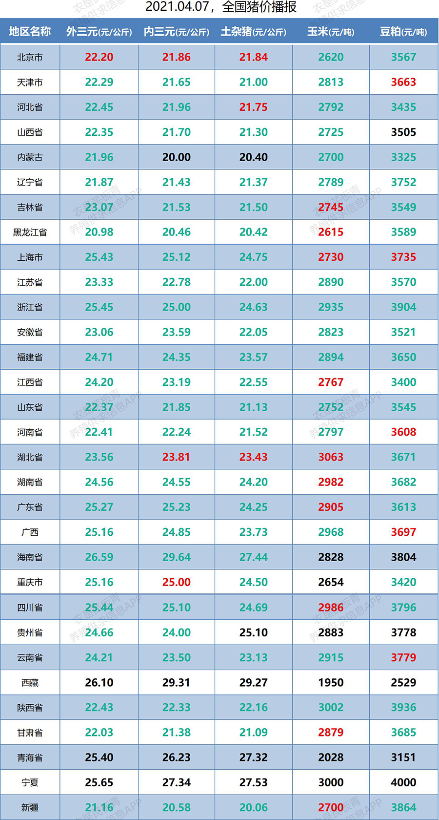 2021.04.07,全国生猪价格播报