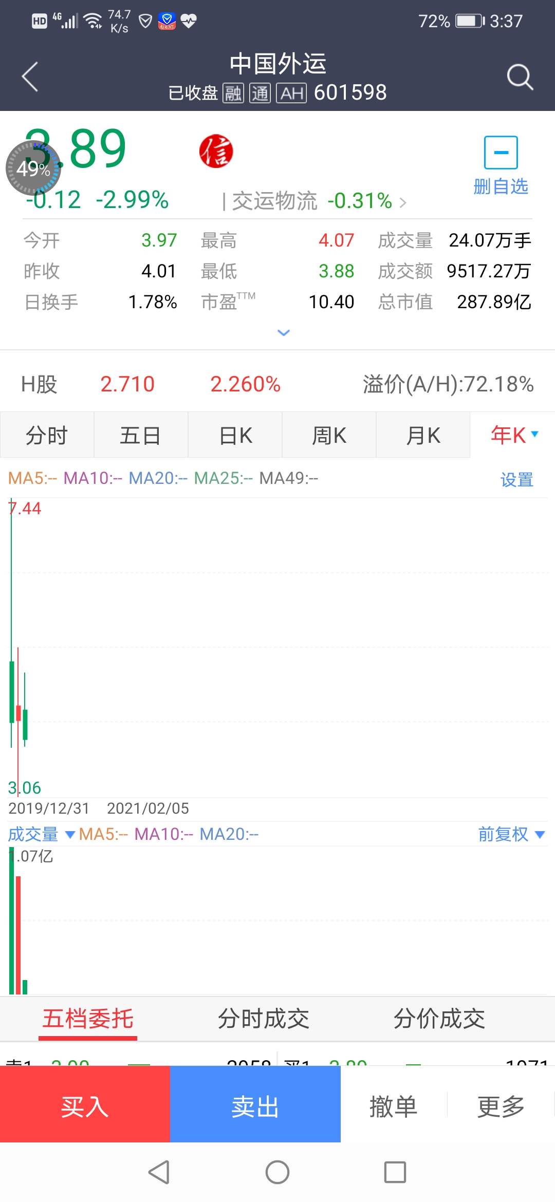 外运月线27根,年线才3根,才上市两年多,2019年才上市。
