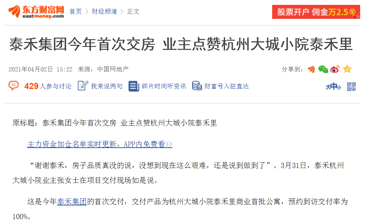 泰禾集团今年首次交房 业主点赞杭州大城小院泰禾里