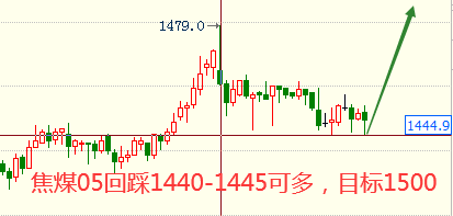 年底,煤炭看涨氛围十足,预计在01合约交割前,煤炭都将维持一个多头走势,一旦出现回落企稳,可大胆参与多单。建议:焦煤05合约可回踩1440-1445区间跟进多单,止盈看到1480/1500,止损带1420!