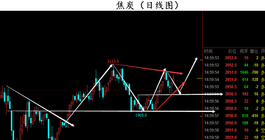 焦炭从年初开始,价格持续走高,创新高2112之后的一波回落1905,这一则区间可作为上涨中转站,当价格再次冲高,不破前高,形成收缩三角形态,日线结构有过虚破2000点重要支撑后再次拉升,且日线企稳2000点上方,焦炭在晚间开盘择机进场多单为方向,目标次高以及破新高,多头趋势,多单可持长线