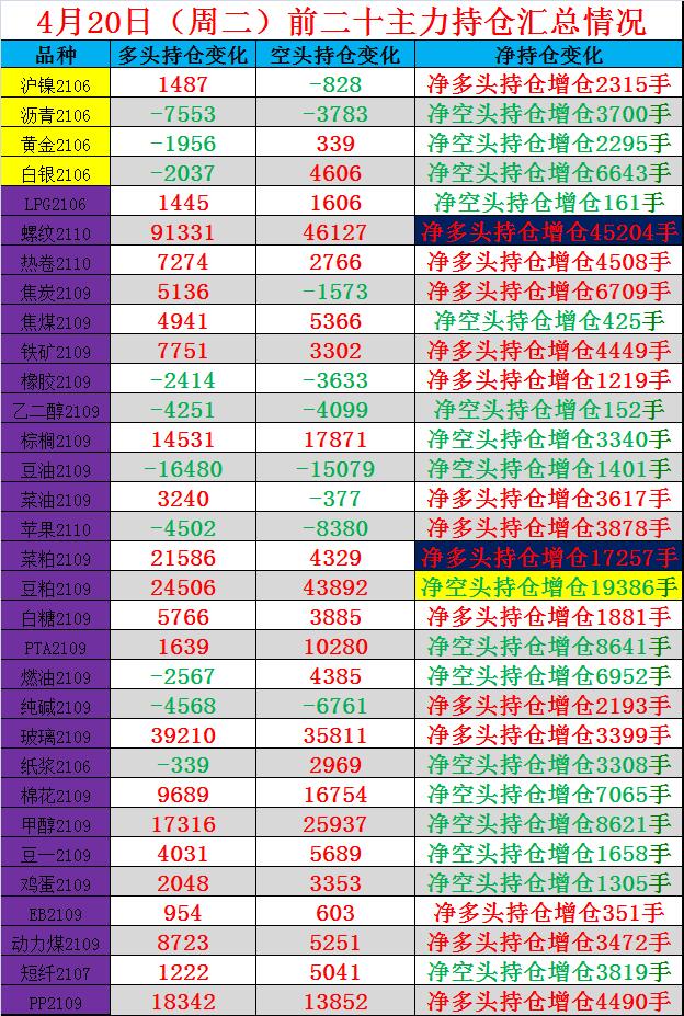 4月20日前二十主力持仓汇总