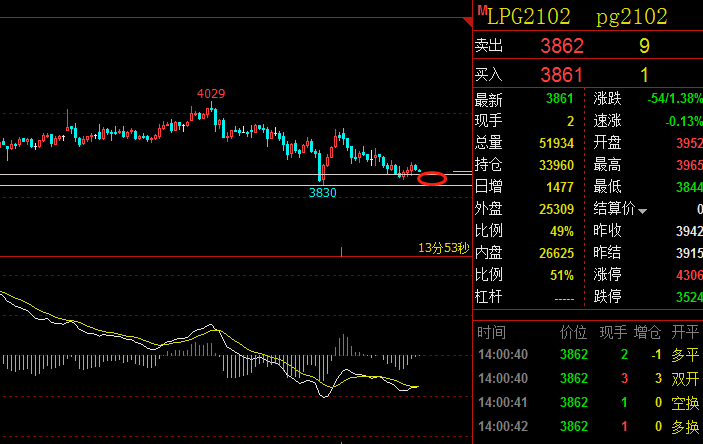 液化气2102合约,期价回落低点触及3844一线,尔后震荡回升,目前来看,30分钟 macd 指标有待修复,预计持续回落应有限,看上涨为主。