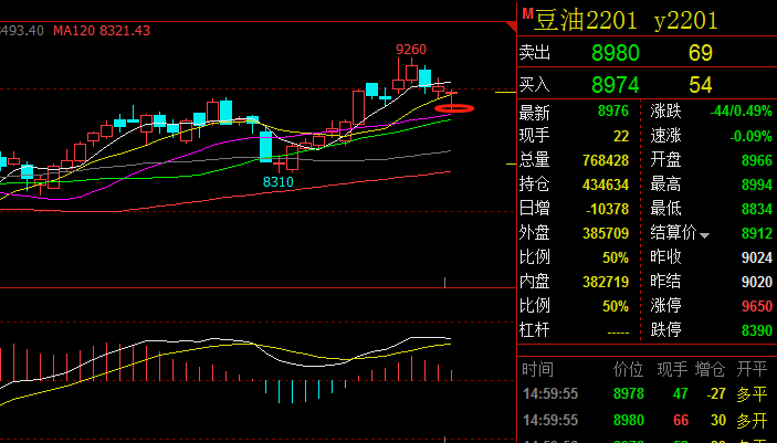 豆油2201合约,期价回落低点触及8834一线,受下方平台支撑,期价回升,收于10日均线上方,整体期价处于高位运行,预计应有反复行情实现 。