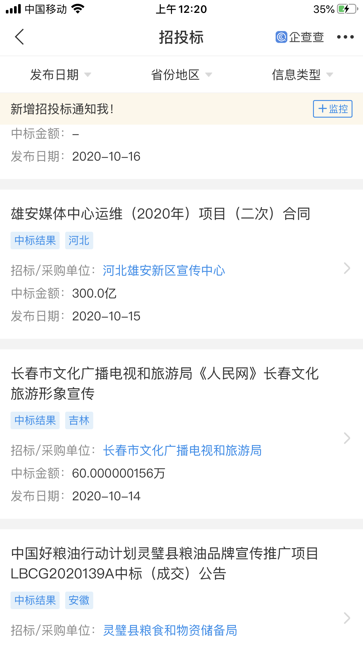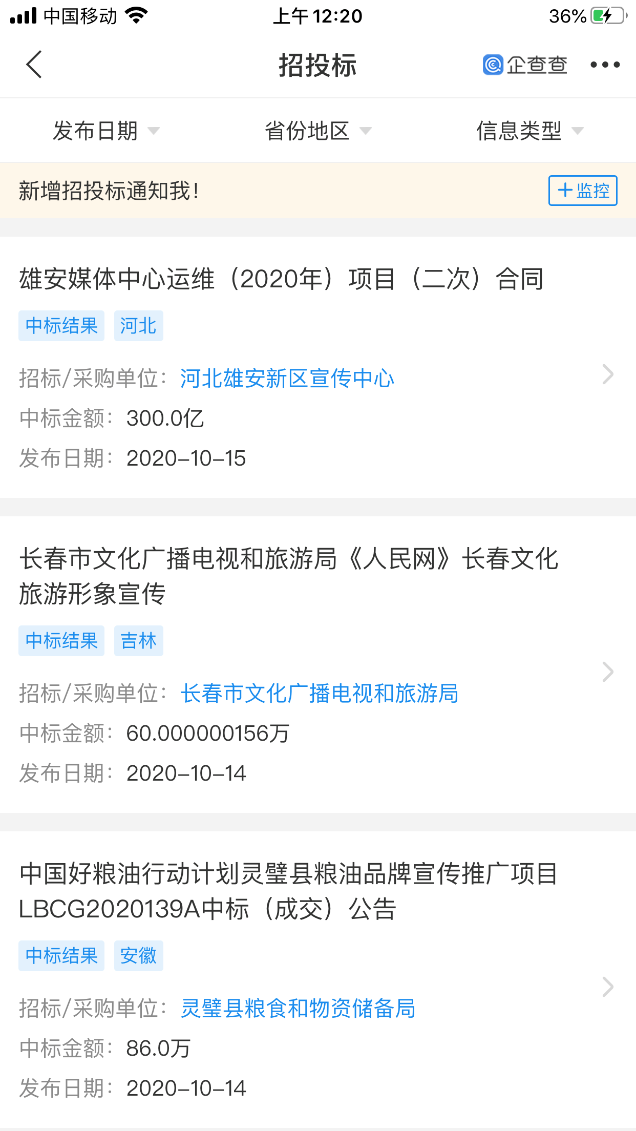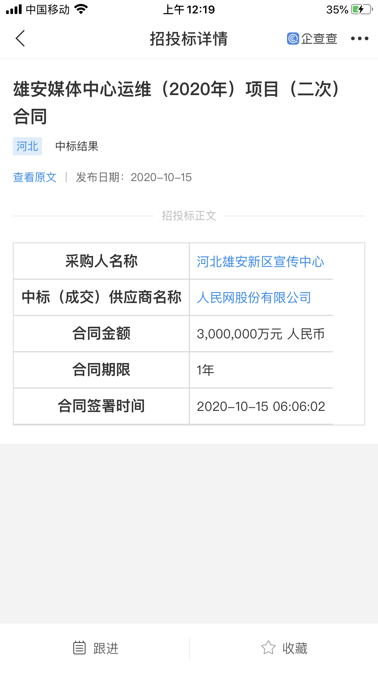从企查查上看到人民网中标300亿雄安媒体中心运维(2020年)项目(二次)合同