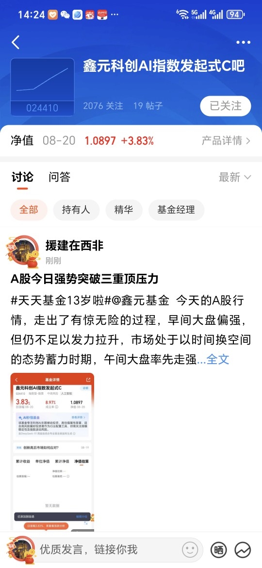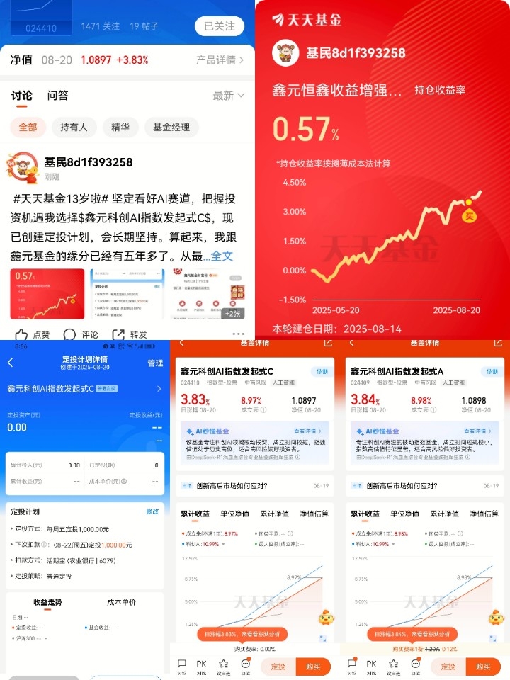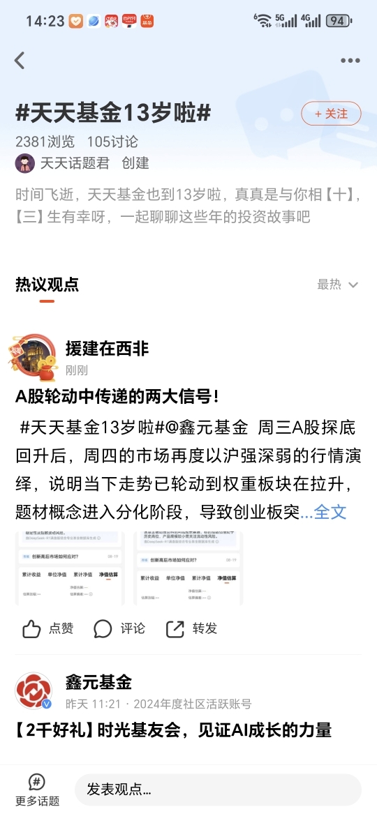 2. 在上述指定基金把发布新帖,带话题#天天基金13岁啦#,新发期间已上车的持有人伙伴:晒收益+分享你当时的配置理由,非持有人伙伴:加自选截图+谈谈你看好AI赛道的理由以及会选择的上车时点!(与本活动主题相关,且大于80字有效文字)并@鑫元基金 ;
