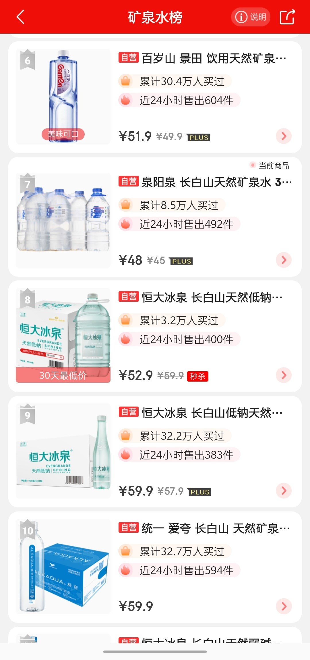 泉阳泉京东销售榜第七名,排名在恒大冰泉前面了,两市唯一矿泉水就值100亿市值??